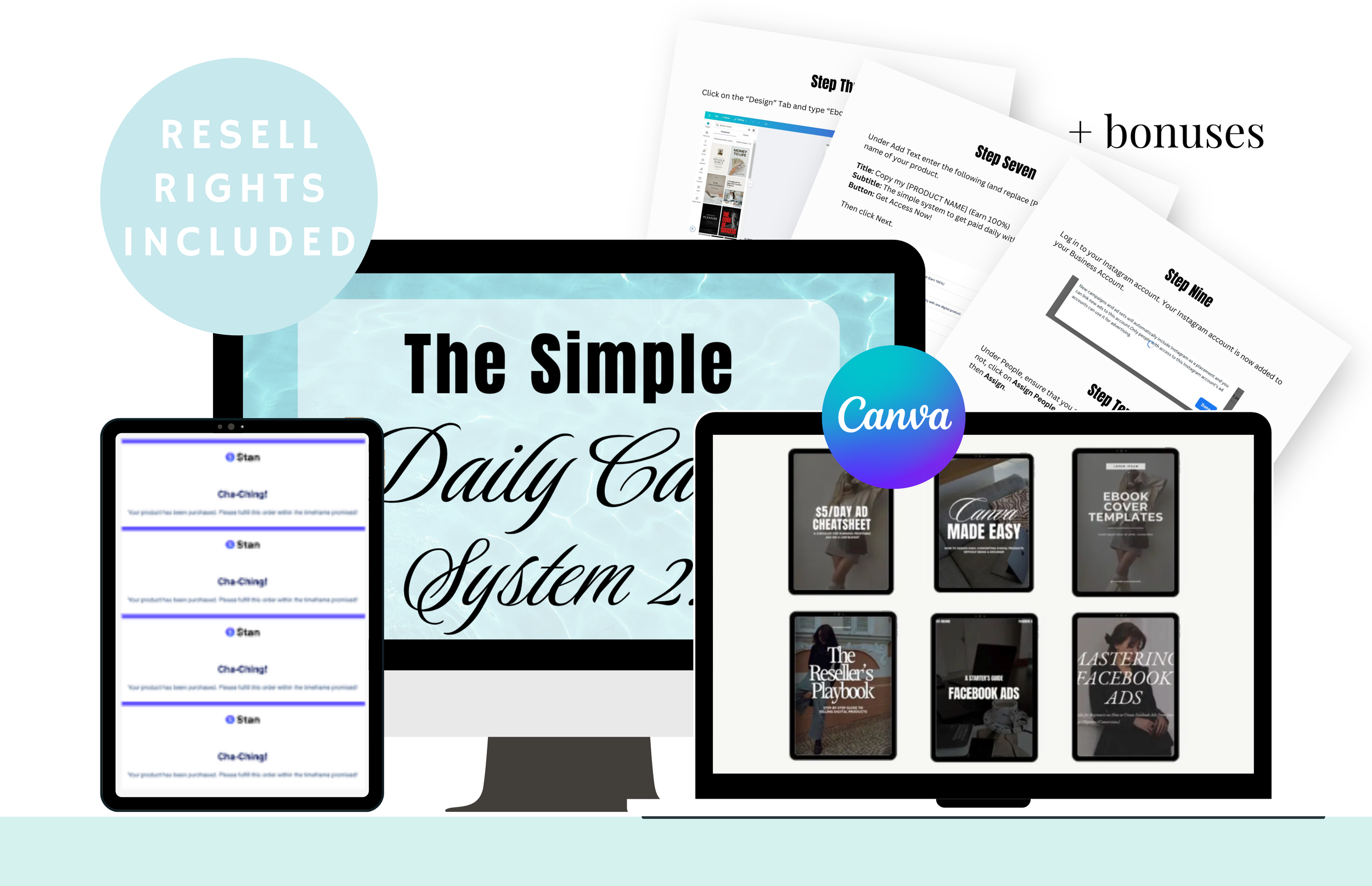 The Simple Daily Cash System shows you how to start making sales from one digital product, and my bonuses make it even easier to grow faster, post smarter, and scale sooner